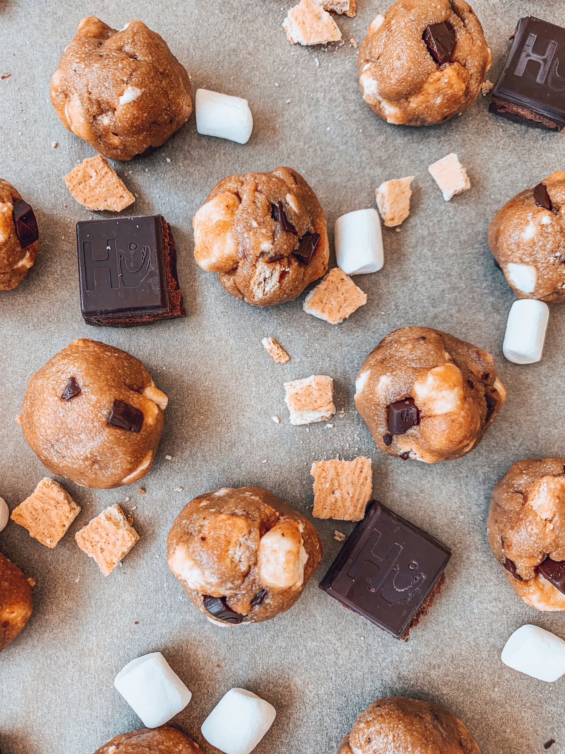 Also, I ended up chopping up my graham crackers and mixing them into the batter, but you can also place a graham cracker square right on the baking sheet and top it with the cookie dough ball. When the cookies bake, they will bake right over the graham cracker so the bottom of the cookie ends up like a graham cracker crust – SO yum!