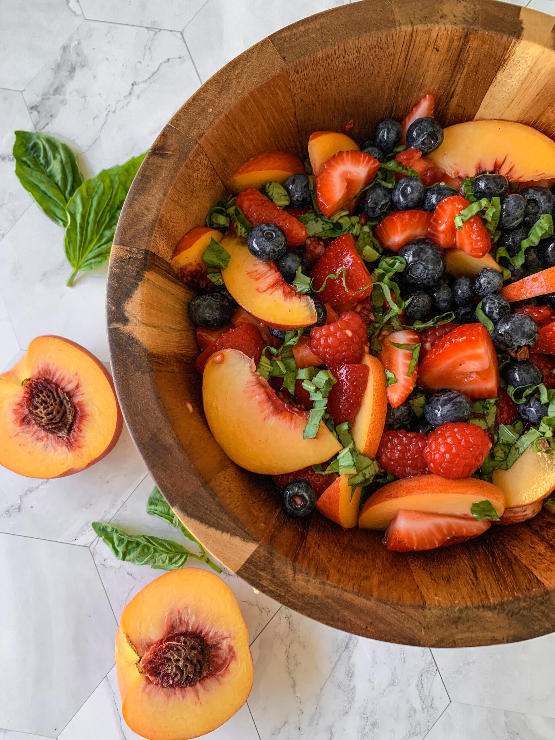 Next, dry off the fruit with paper towels and thinly slice the strawberries, peach, and basil. Add the sliced fruit and basil to a bowl and combine with the raspberries and blueberries.