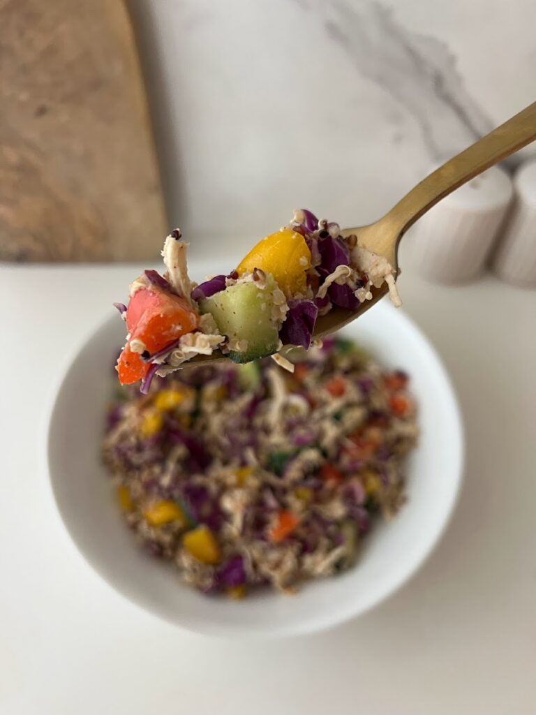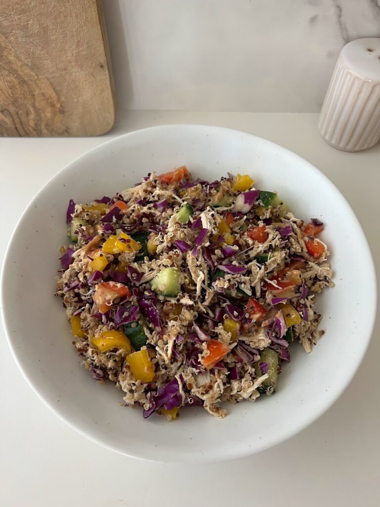 In a large bowl, combine quinoa, cabbage, cucumber, bell pepper and chicken.