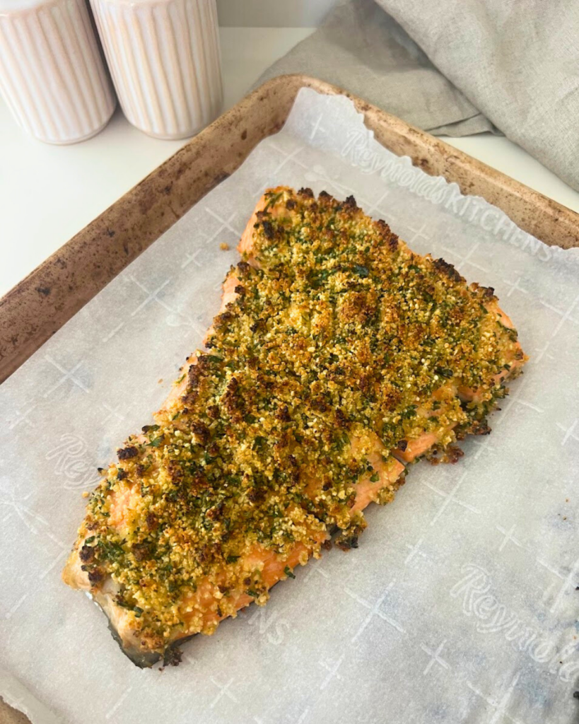 The magic lies in its simplicity; it’s a one-pan wonder that combines the richness of salmon with the crispiness of “parmesan” breadcrumbs, all while cooking in just 15 minutes for a true no-hassel dinner.