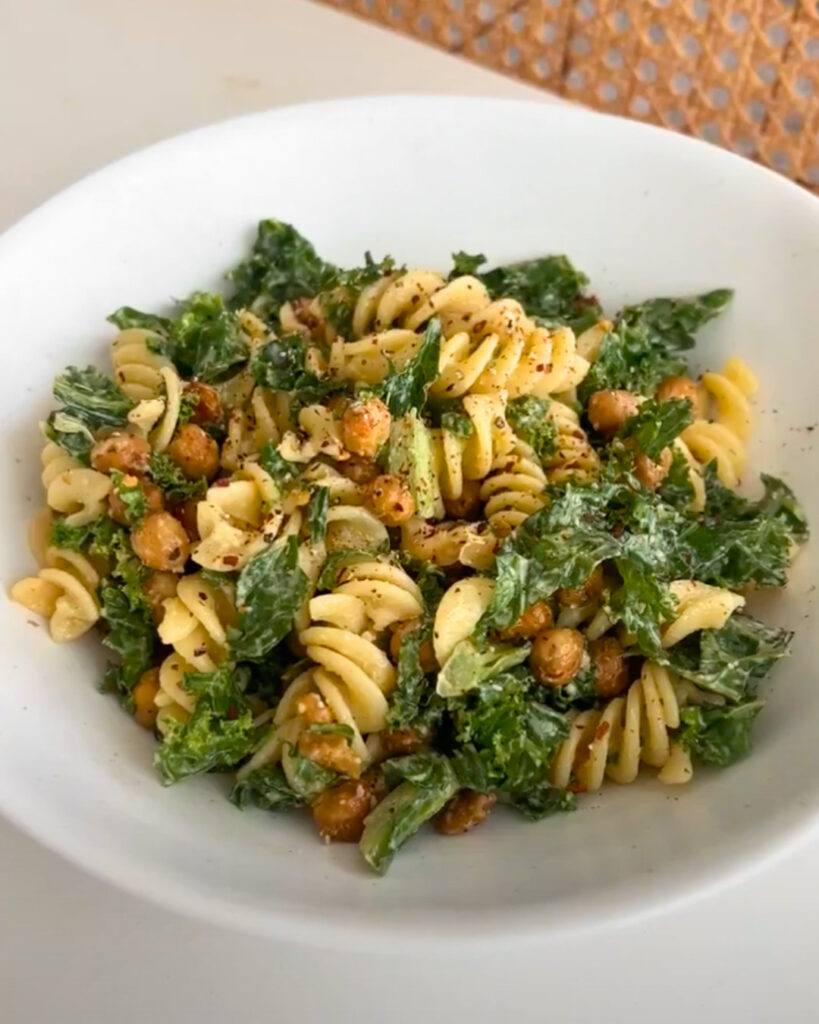 In a large bowl, combine cooked and cooled pasta, kale, crispy chickpeas and caesar dressing. Enjoy!