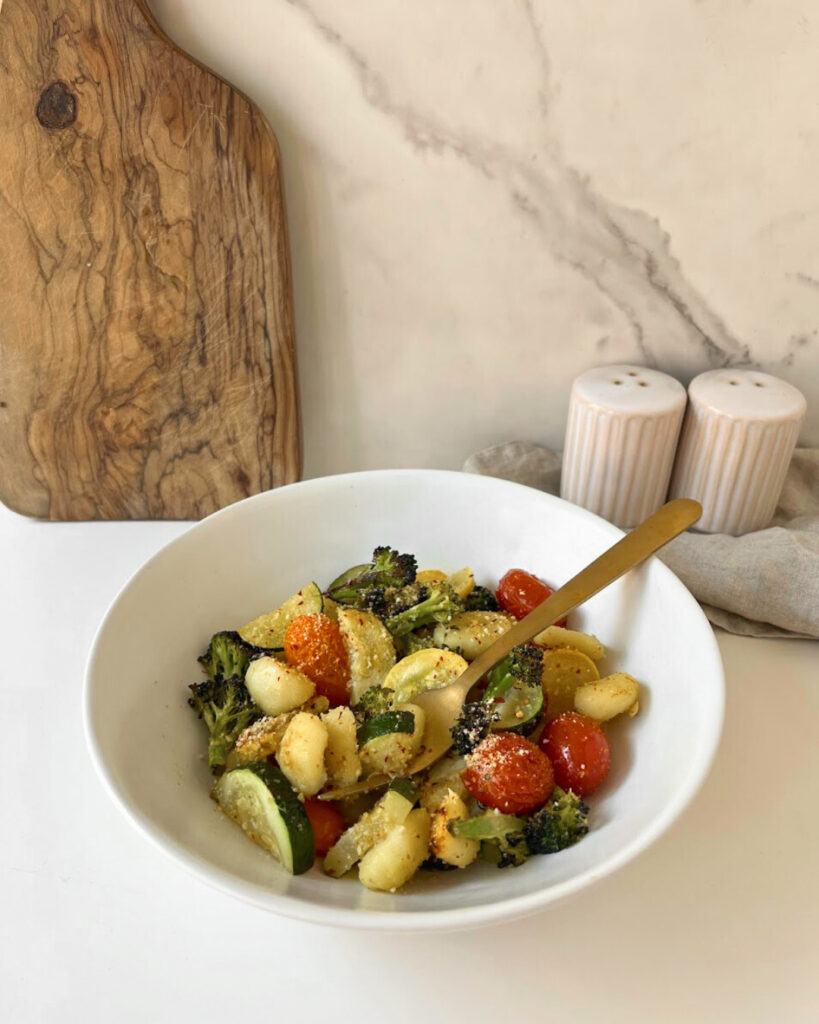Try my Easy Vegetarian Sheet Pan Gnocchi Recipe for a quick weeknight dinner! Roasted zucchini, squash, broccoli, and cherry tomatoes with potato gnocchi, this recipe is packed with flavor and is ready in under 30 minutes.