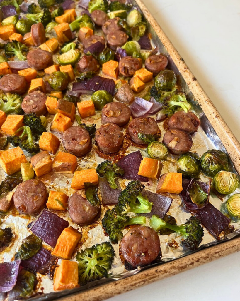Enjoy a delicious and hassle-free meal with my Maple Roasted Chicken Sausage & Vegetables recipe. This gluten-free, dairy-free sheet pan dinner is ready in under 30 minutes, making it the perfect weeknight choice for a quick and wholesome meal.