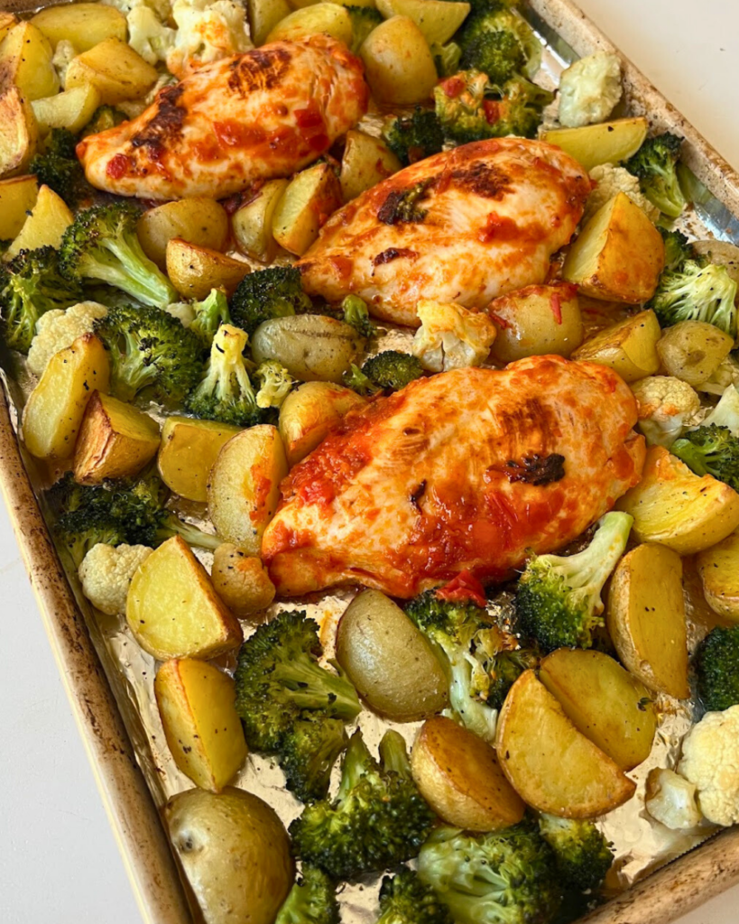 Return the tray back to the oven for 25 minutes (or until chicken is cooked through and veggies are tender).