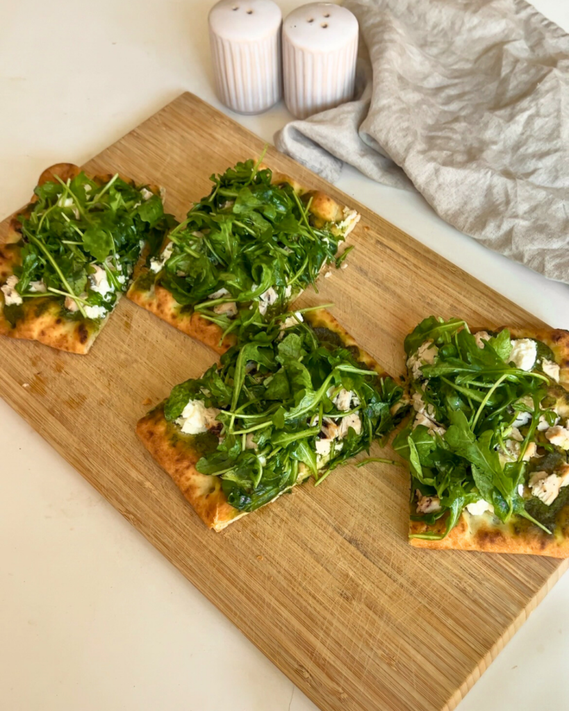 A Must-Try Trader Joe’s Recipe: Pesto Ricotta Chicken Flatbread! It’s a quick and easy 20-minute dinner recipe that’s packed with flavor. Enjoy crispy flatbread topped with vegan kale pesto, creamy ricotta, and juicy chicken, finished with a zesty arugula salad.