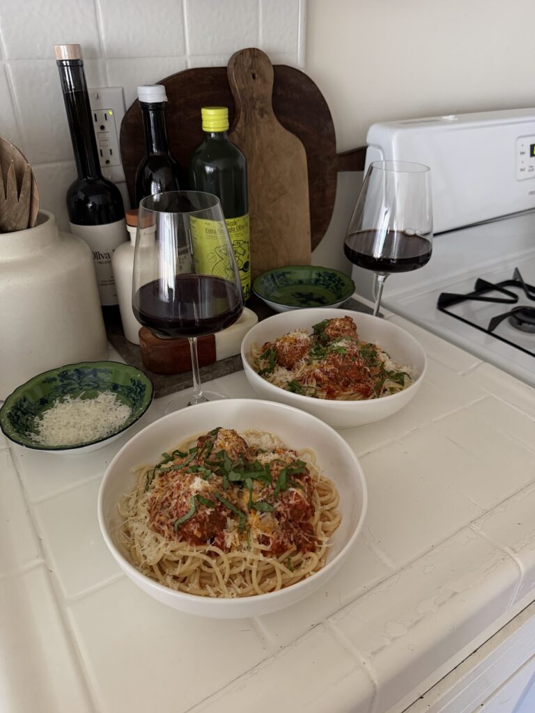 A big bowl of spaghetti and homemade meatballs is perfect for a Valentine’s Day or at-home date night. It’s comforting, sharable, and feels a little fancy without being complicated. These baked beef and pork meatballs are juicy, tender, and packed with flavor. Baking them first gives you a nicely browned exterior, then they finish simmering in sauce so they soak up all that richness. I love serving them over spaghetti with extra parmesan and fresh basil for the ultimate cozy date-night dinner!